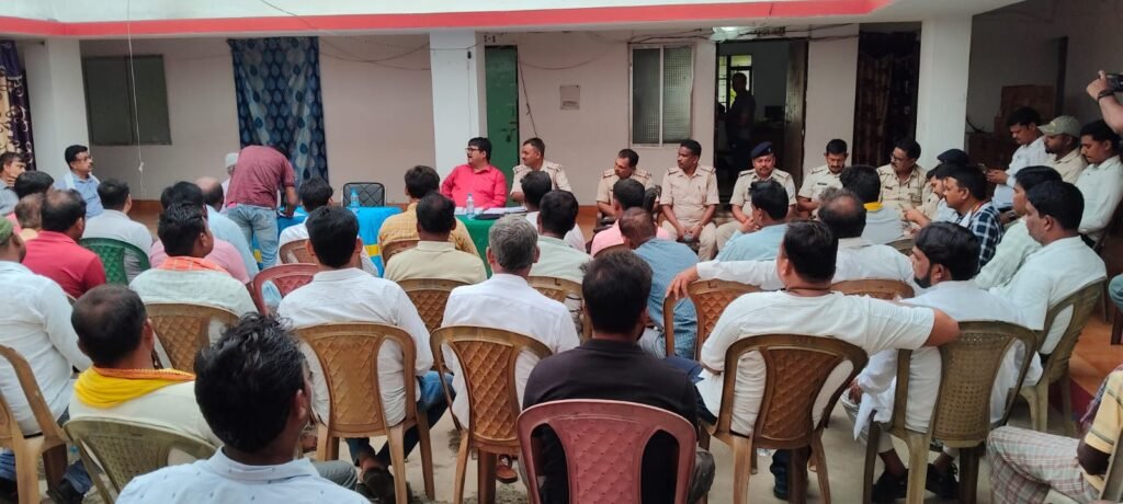 साथ ही मूर्ति विसर्जन में थाना सूचित करने का निर्देश दिया। उन्होंने कहा कि किसी भी उपद्रवी तत्व द्वारा यदि सामाजिक सौहार्द बिगाड़ने की कोशिश की जाती है, तो उन्हें बख्शा नहीं जाएगा। उन्होंने लोगों से अपील की कि वे प्रशासन का सहयोग करें और शांति एवं भाईचारे के साथ पर्व मनाएं। वही थाना प्रभारी अमर कुमार मिंज ने कहा कि पूजा के दौरान सोशल मीडिया पर आपत्तिजनक वीडियो या फोटो पोस्ट करना पूरी तरह प्रतिबंधित है। प्रशासन की सोशल मीडिया गतिविधियों पर पैनी नजर रहेगी और गलत पोस्ट करने वालों पर कड़ी कार्रवाई की जाएगी। पूजा पंडालों में डीजे बजाने पर पूर्ण रूप से रोक रहेगी। उन्होंने कहा कि पर्व के दौरान किसी भी प्रकार की अप्रिय घटना रोकने के लिए विशेष गश्ती दल का गठन किया गया है। साथ ही असामाजिक तत्वों पर लगातार नजर रखी जाएगी।