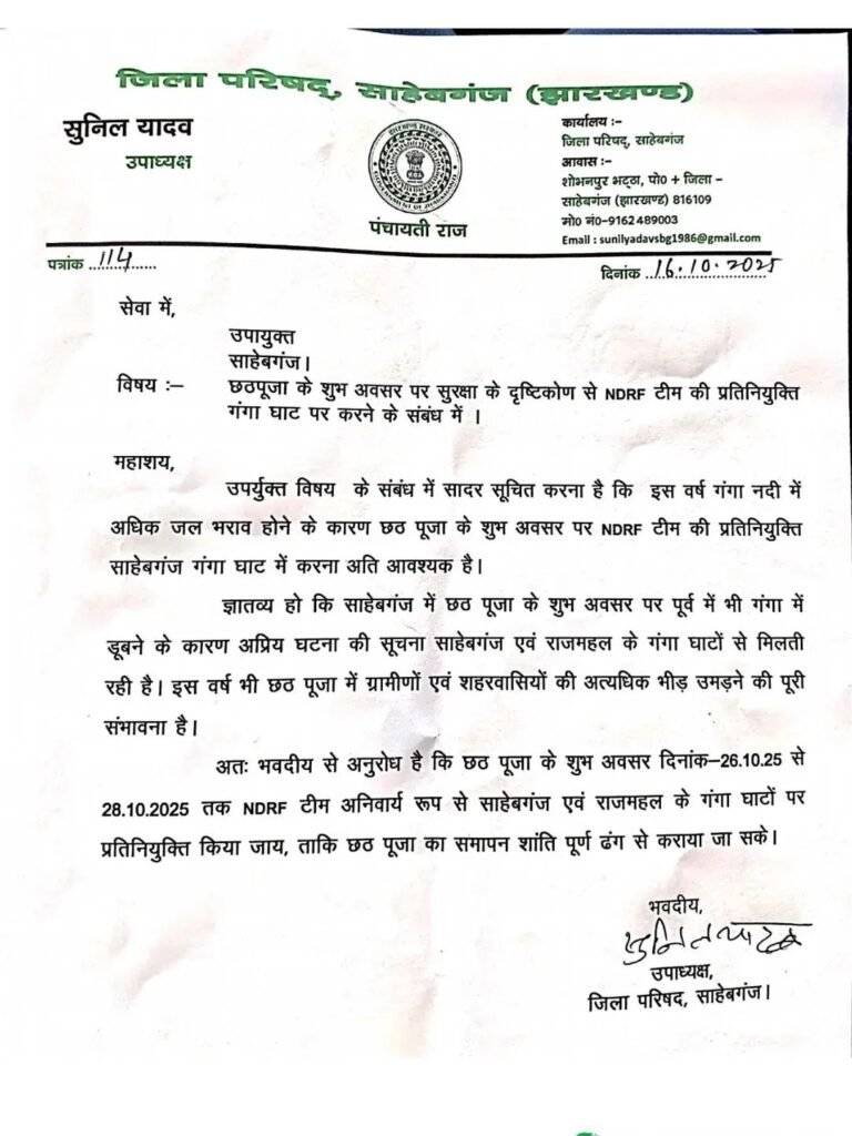 सुनील यादव ने अपने पत्र में उल्लेख किया है कि हर वर्ष छठ पूजा के अवसर पर साहिबगंज और राजमहल के गंगा घाटों पर हजारों की संख्या में श्रद्धालु पूजा-अर्चना के लिए जुटते हैं। भीड़ और नदी के तेज बहाव के बीच अक्सर डूबने जैसी अप्रिय घटनाएं घटित होती रही हैं। ऐसे में इस बार विशेष सतर्कता बरतने की आवश्यकता है।