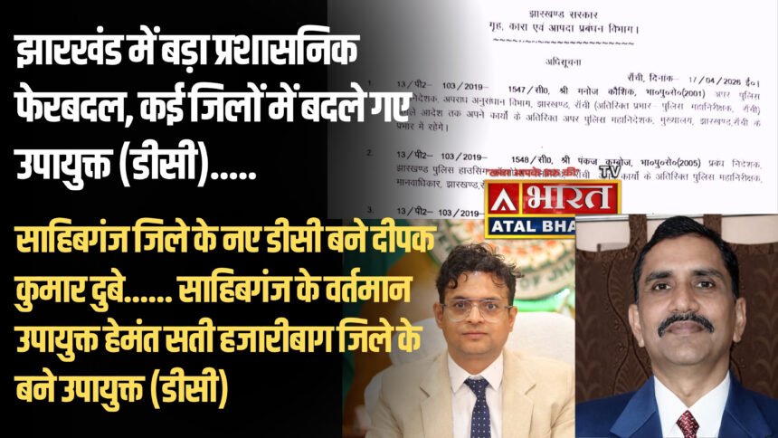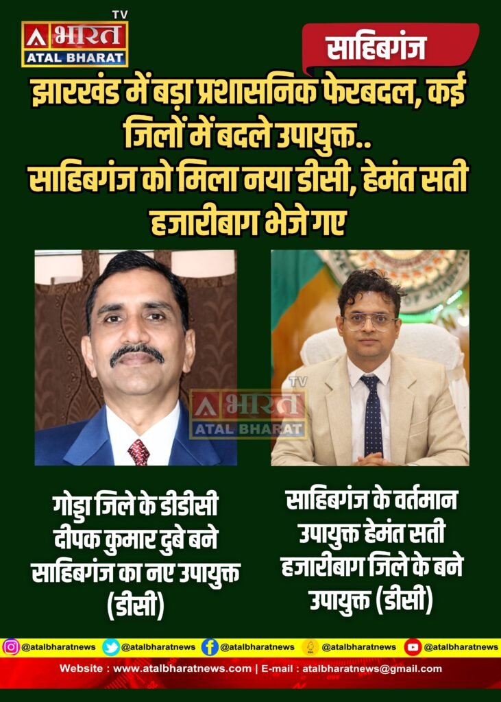 गोड्डा के डीडीसी दीपक कुमार दुबे को साहिबगंज का नया उपायुक्त (डीसी) बनाया गया है। वहीं साहिबगंज के वर्तमान उपायुक्त हेमंत सती को स्थानांतरित कर हजारीबाग का डीसी नियुक्त किया गया है।अन्य जिलों में भी व्यापक बदलावदिलीप प्रताप सिंह शेखावत को पलामू, सौरभ कुमार भुवानिया को खूंटी, आलोक कुमार को जामताड़ा, शशि प्रकाश सिंह को देवघर, मनीष कुमार को पश्चिमी सिंहभूम, ऋतुराज को रामगढ़ और रवि आनंद को चतरा का उपायुक्त बनाया गया है।