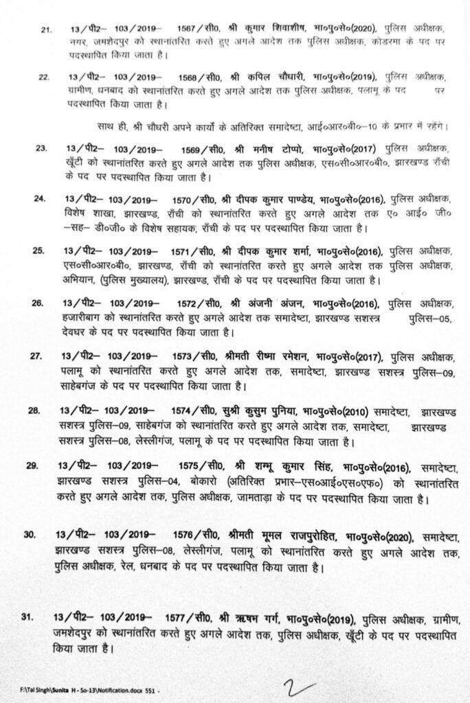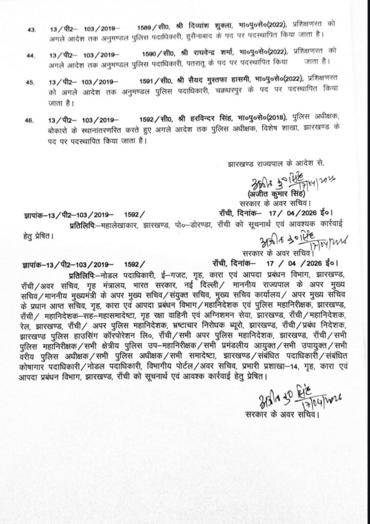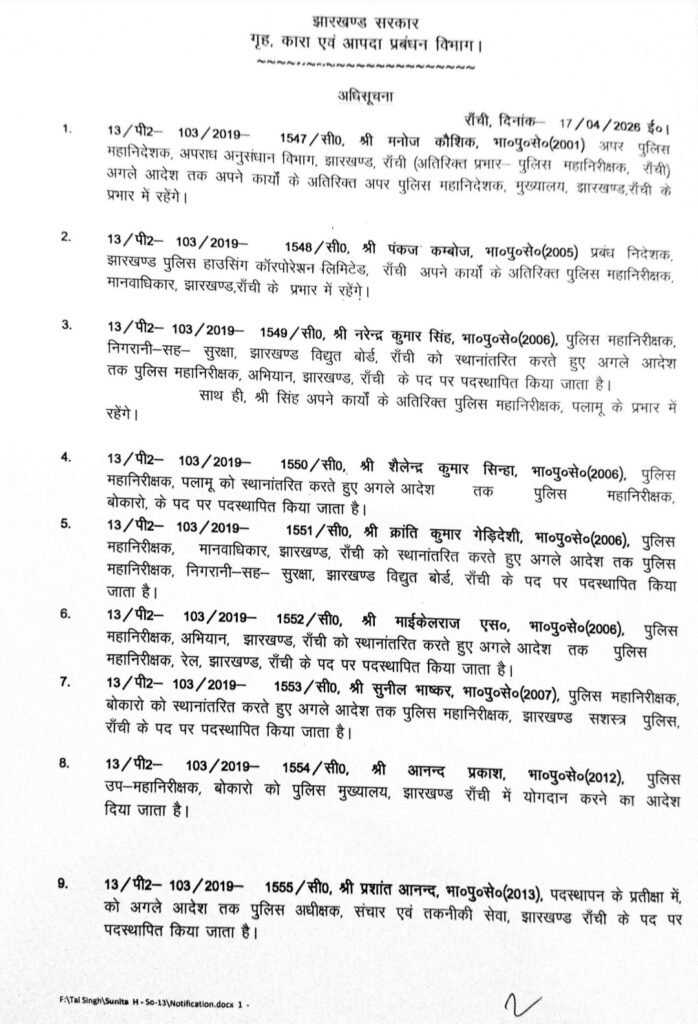 रांची/संवाददाता: झारखंड सरकार ने शुक्रवार को बड़े पैमाने पर प्रशासनिक फेरबदल करते हुए आईएएस अधिकारियों के तबादले और पदस्थापन का आदेश जारी किया है। कार्मिक विभाग की अधिसूचना के अनुसार कई अधिकारियों को जिलों में उपायुक्त (डीसी) के रूप में नई जिम्मेदारी दी गई है, जबकि कई जिलों के डीसी का स्थानांतरण किया गया है।