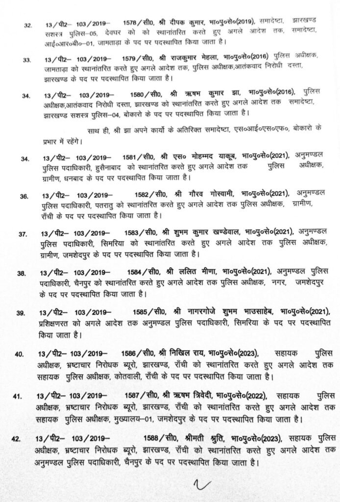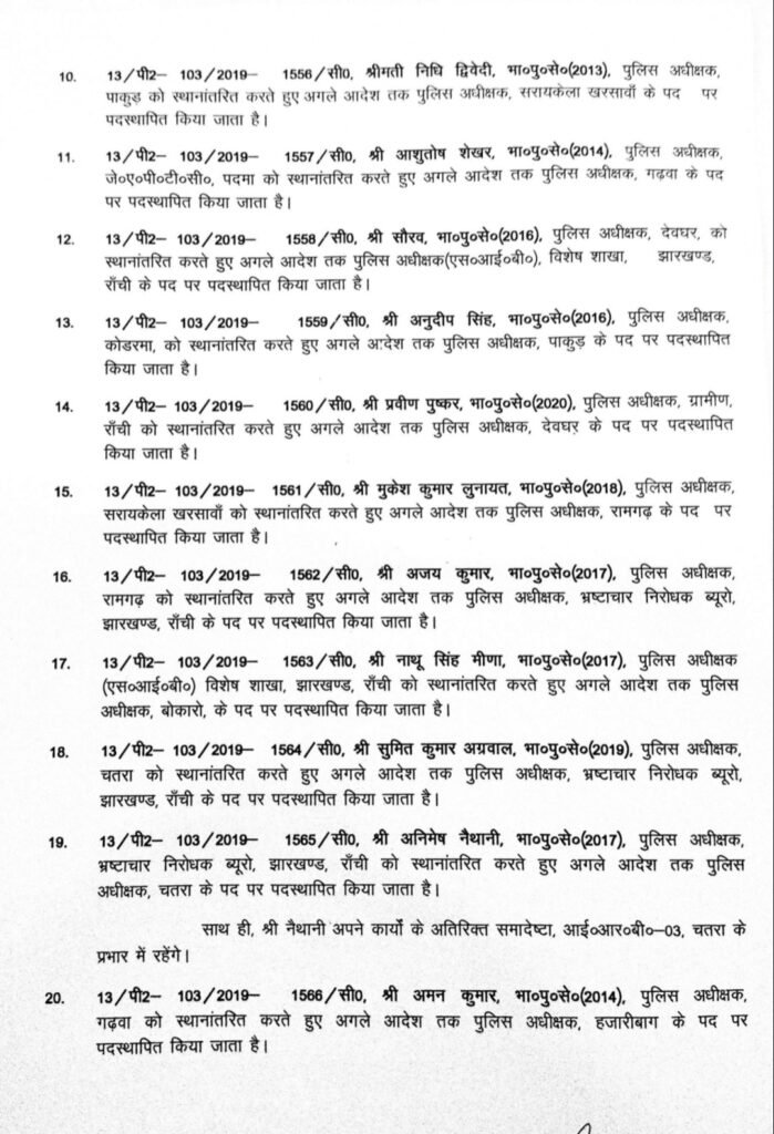 जारी आदेश के अनुसार संदीप कुमार मीणा को लोहरदगा, राजीव रंजन को पूर्वी सिंहभूम, संदीप कुमार को लातेहार, उत्कर्ष गुप्ता को कोडरमा और अनन्य मित्तल को गढ़वा का उपायुक्त बनाया गया है। वहीं मेघा भारद्वाज को पाकुड़ तथा लोकेश मिश्रा को गोड्डा का डीसी नियुक्त किया गया है।